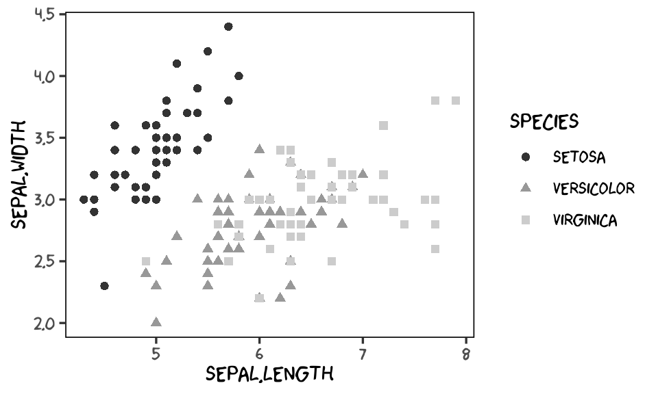 ggplot(data = iris, aes(Sepal.Length, Sepal.Width)) +