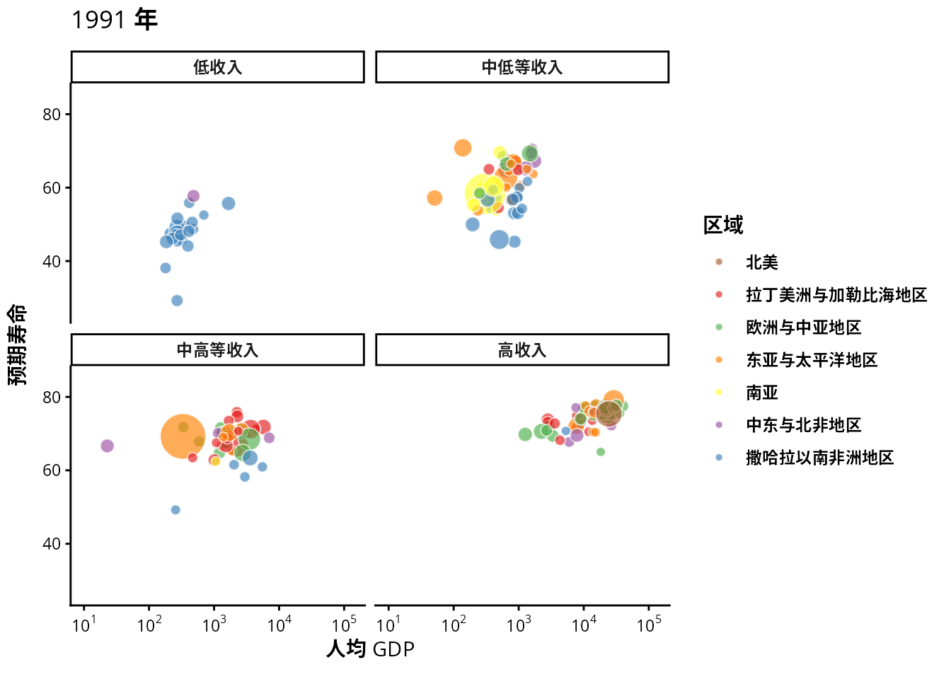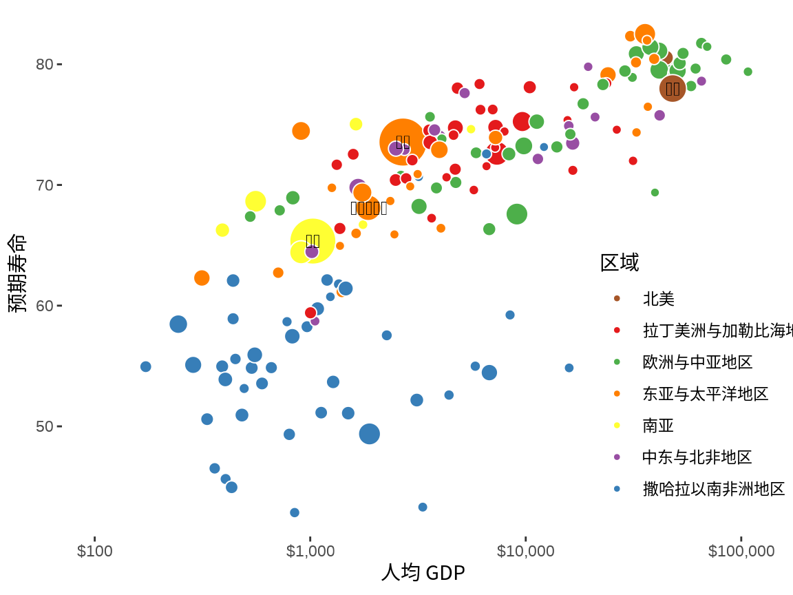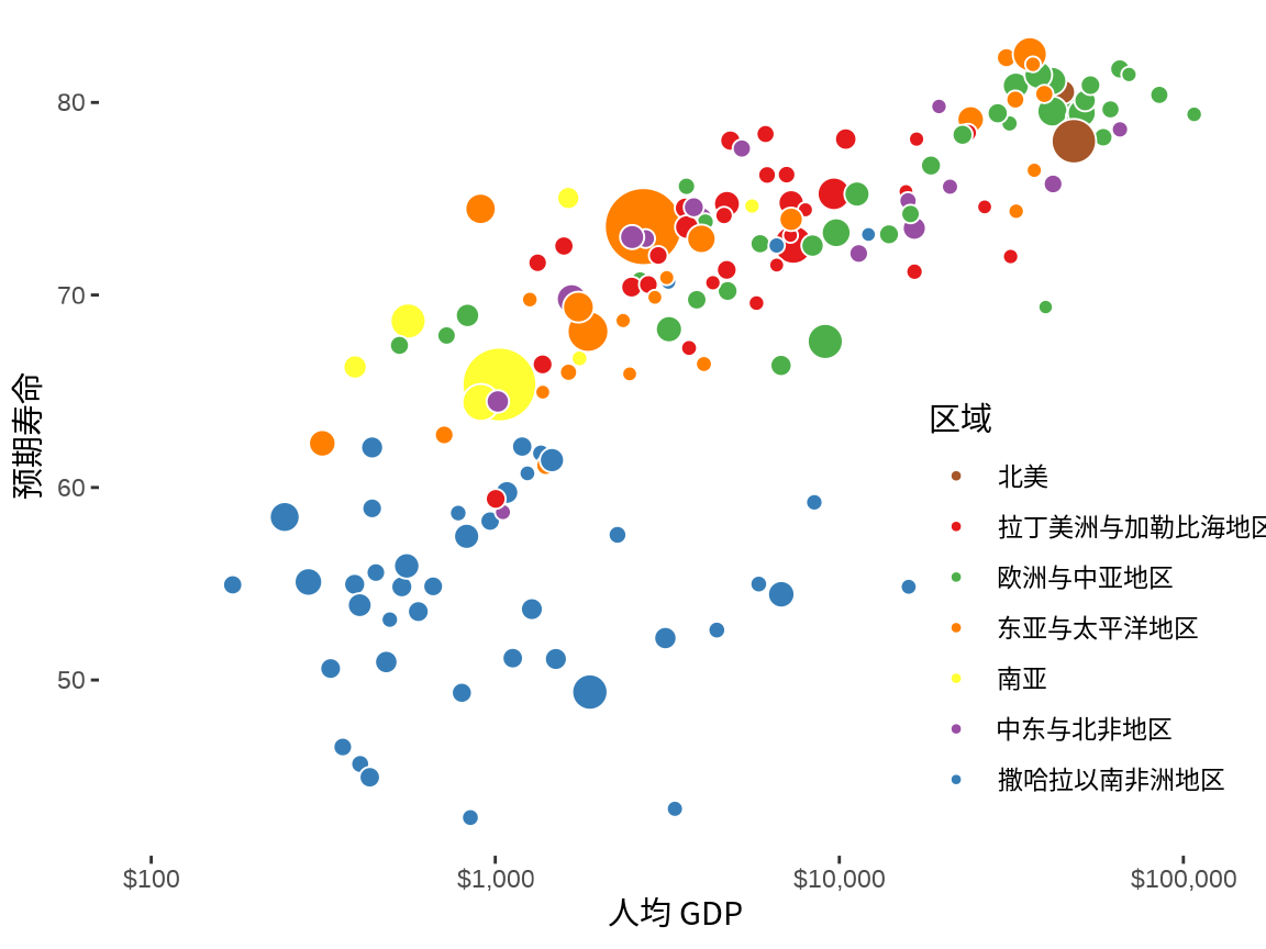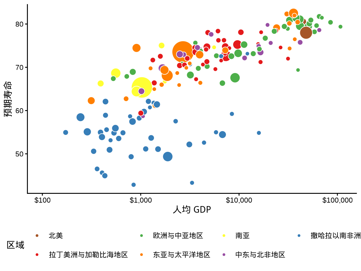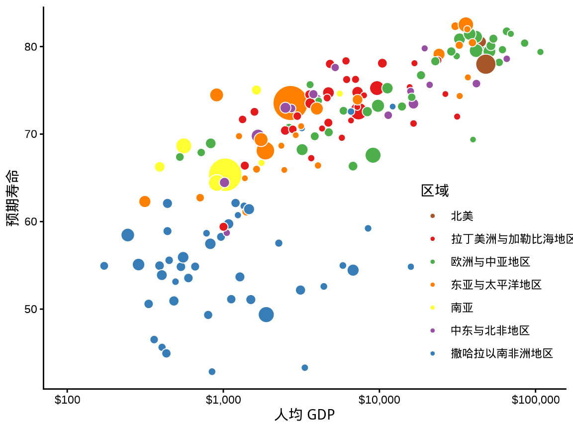 y = "预期寿命", size = "人口总数", fill = "区域"