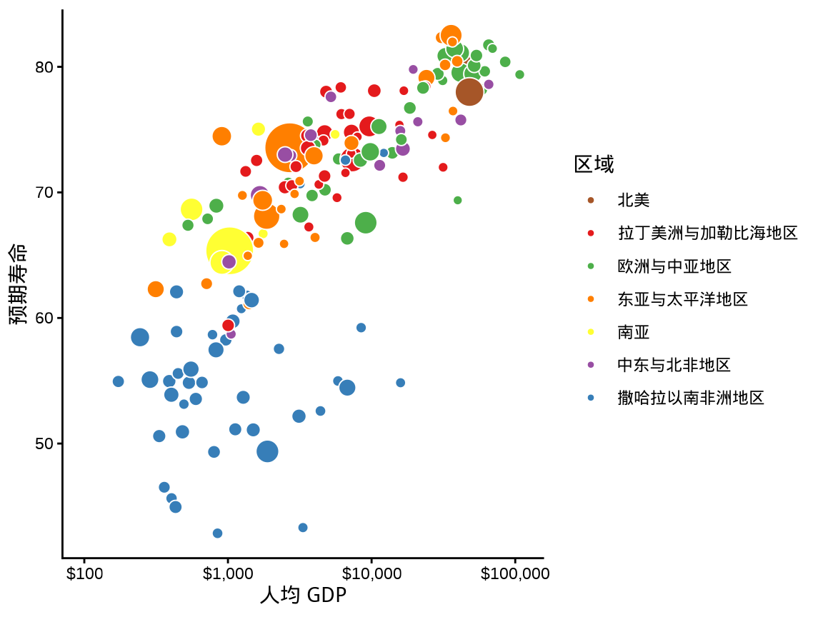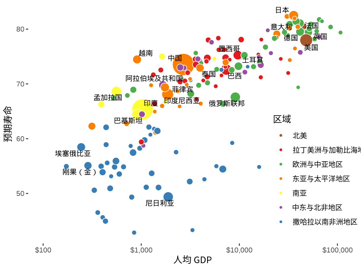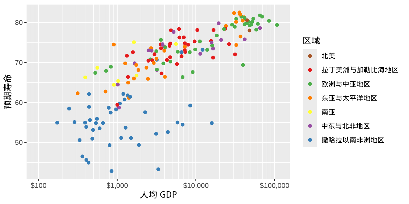 根据横轴所代表的人均 GDP (单位:美元)的实际含义,其实,可以进一步,添加更多的信息,即刻度标签带上数量单位,此处是美元符号。scales 包提供的函数 label_dollar() 可以实现,效果如 图 1.6 。