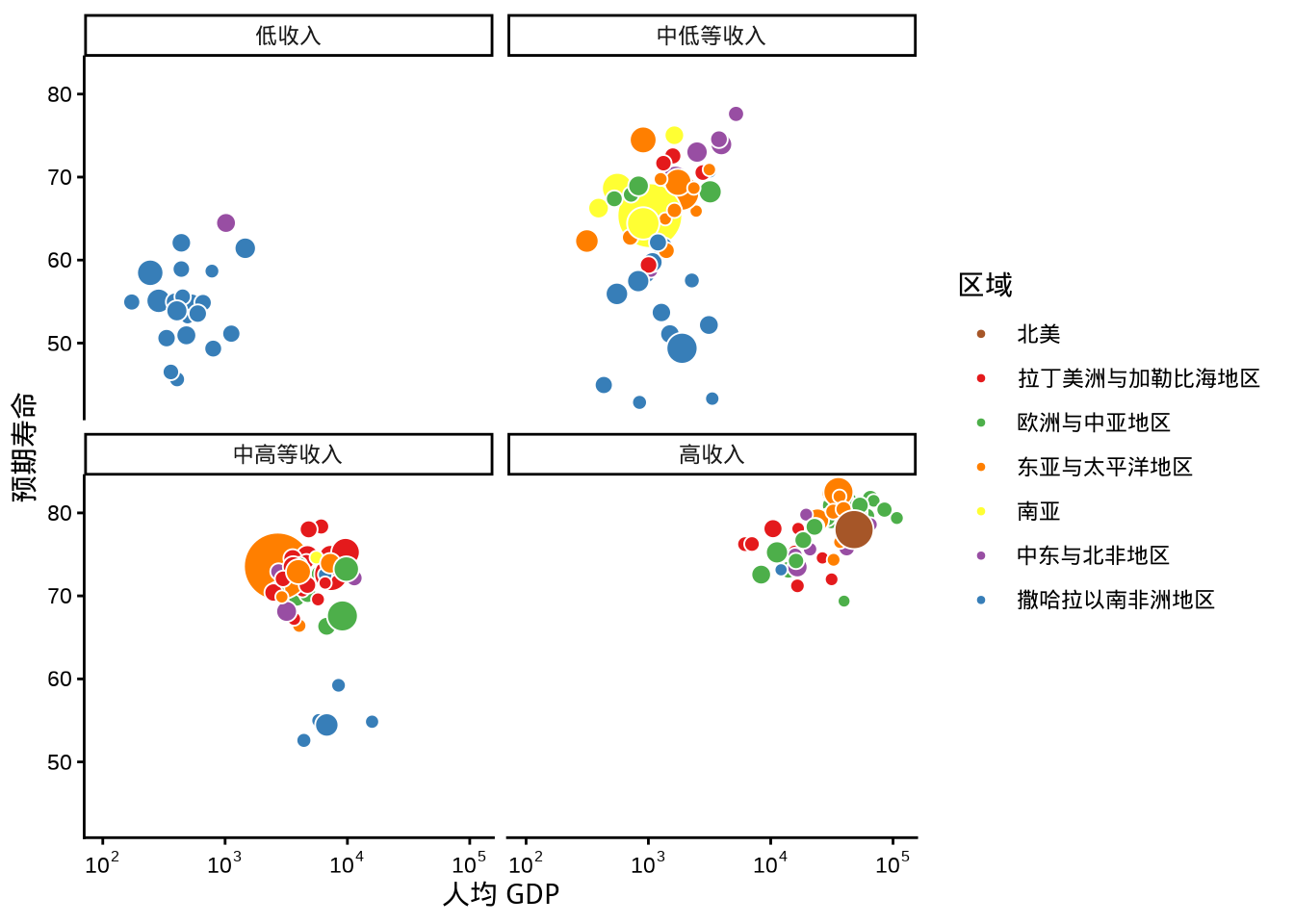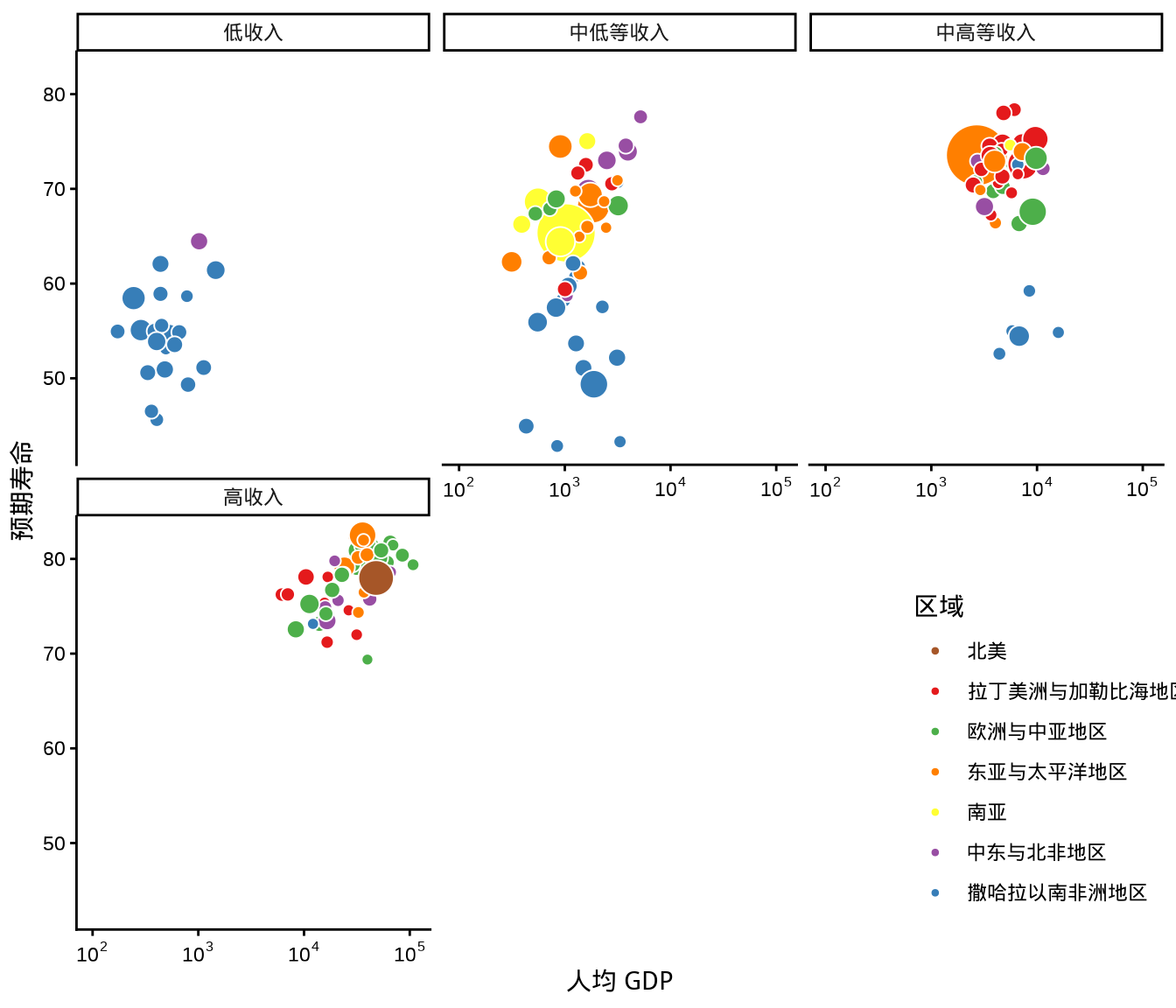 ggplot2 包有两个函数 facet_wrap() 和 facet_grid() 都可以用来实现分面操作,分面的目的是将数据切分,一块一块地展示。下面在 图 1.15 的基础上,按收入水平变量分面,即将各个国家或地区按收入水平分开,效果如 图 1.18 所示。facet_grid() 与 facet_wrap() 的效果是类似的,就不再赘述了。