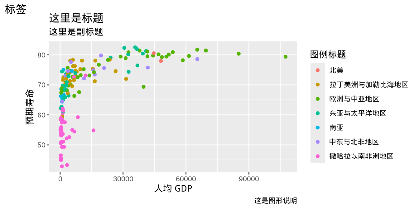 labs(x = "人均 GDP", y = "预期寿命", tag = "标签",