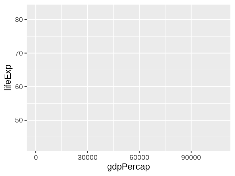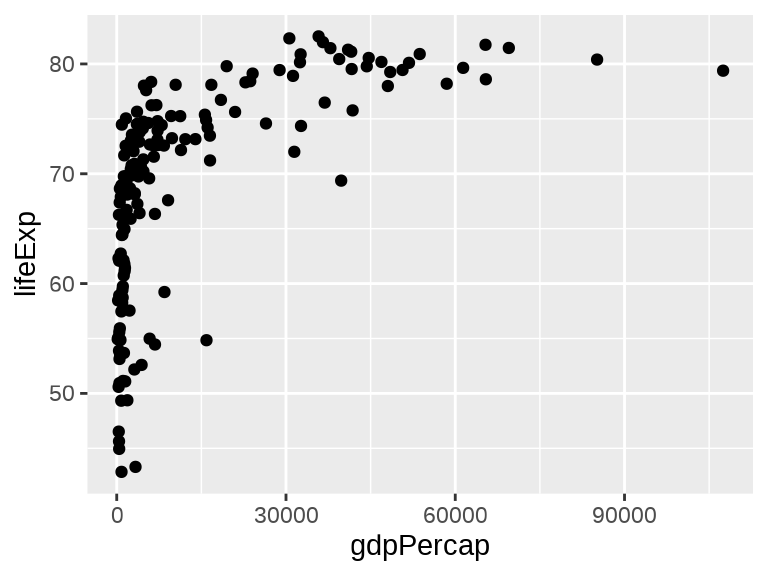 ggplot(data = gapminder_2007, aes(x = gdpPercap, y = lifeExp)) +