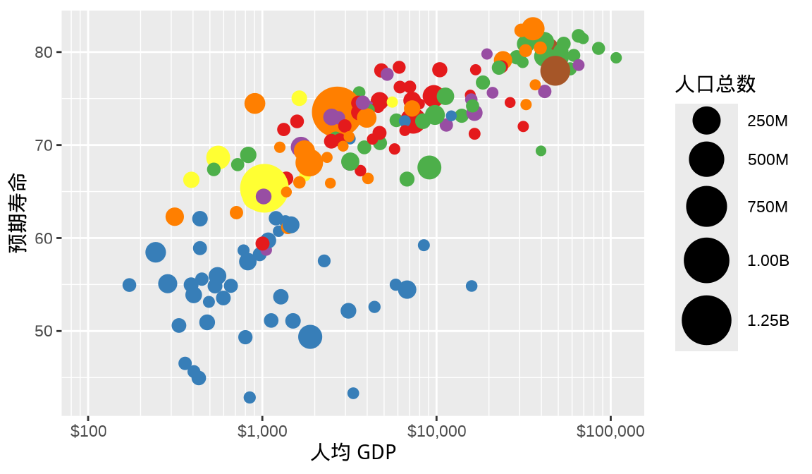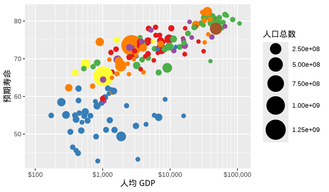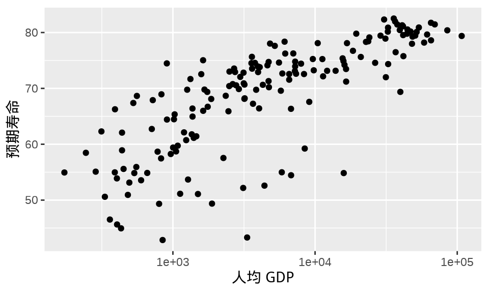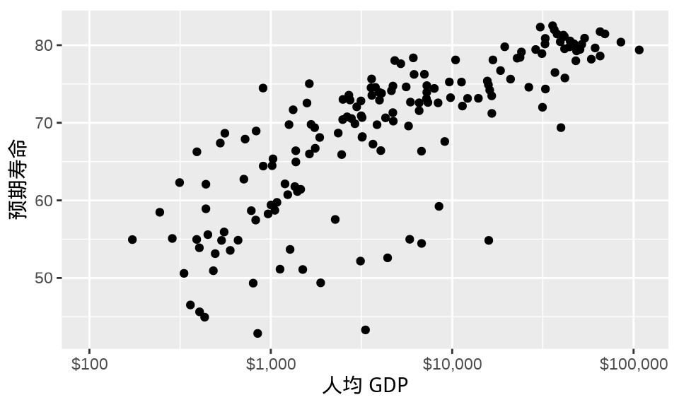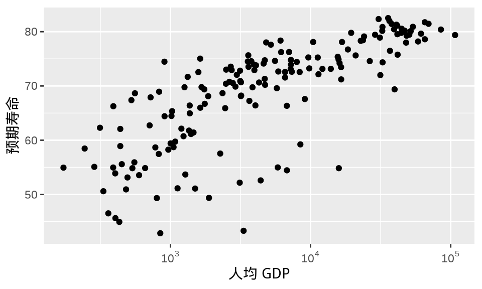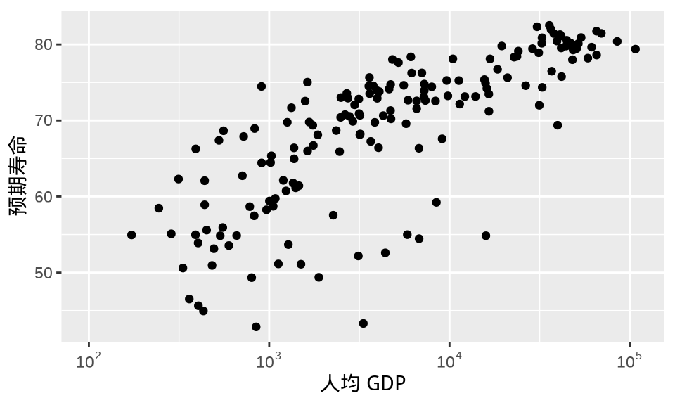 labs(x = "人均 GDP", y = "预期寿命")