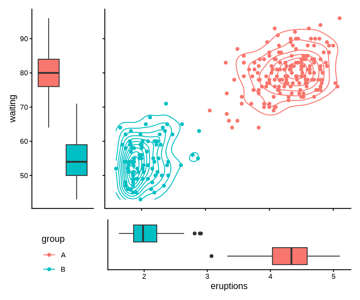 主图是占据着最大篇幅的叠加二维密度曲线的散点图,展示数据的二维分布,两个箱线图辅助展示等待时间 waiting 和喷发时间 eruptions 的分布,而左下角的图例是次要的说明。