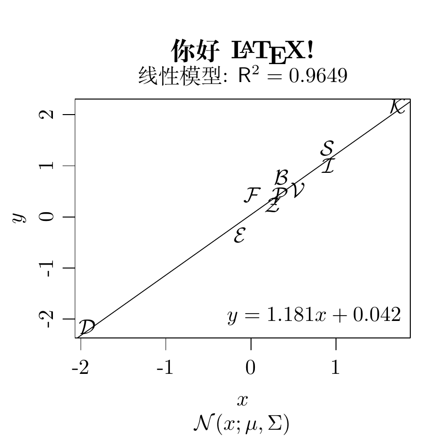 众所周知,Donald Knuth 十年磨一剑,开发了 TeX 排版系统,就是解决排版数学公式的痛点。如 图 6.13 所示,因图形中包含数学公式和符号,为了获得原汁原味的渲染效果,在使用 Base R 绘图的过程中通过 tikzDevice 包引入了 LaTeX 中的 TikZ 绘图引擎。