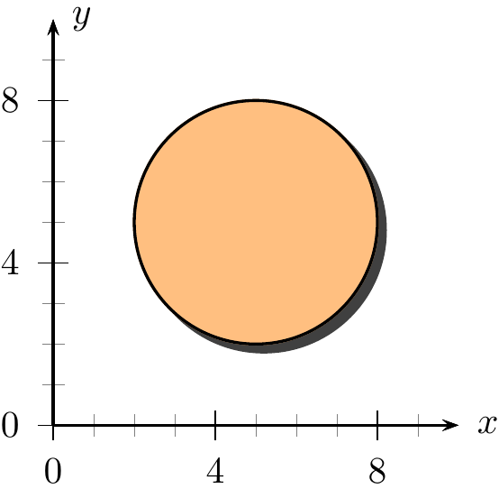 standalone 文类是支持 PSTricks 绘图的,下面在直角坐标系中绘制一个带阴影效果的圆,示例代码如下: