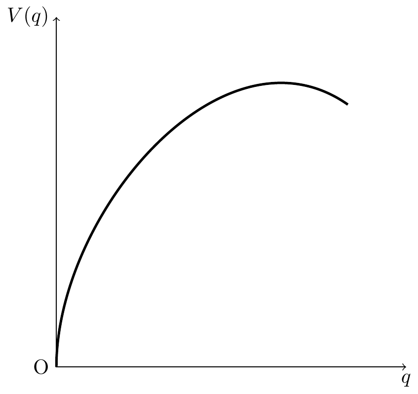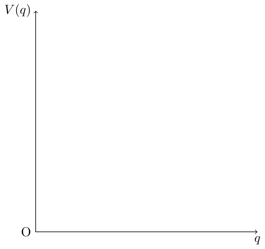 \draw[<->] (6,0) node[below]{$q$} -- (0,0) node[left]{O} -- (0,6) node[left]{$V(q)$};